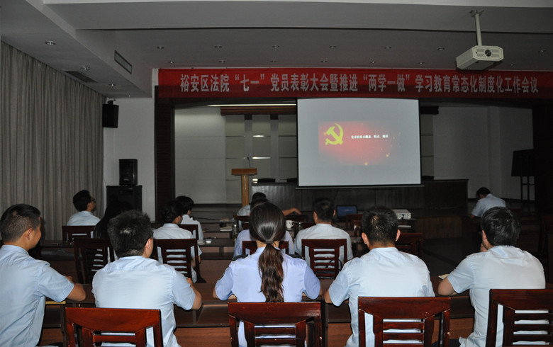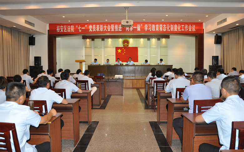 6月30日下午午,裕安区法院召开“七一”表彰大会暨推进“两学一做”学习教育常态化制度化工作会议,学习传达中央、省、市指示精神及区委关于深入推进“两学一做”学习教育常态化制度化工作要求,学习贯彻廖俊波同志先进事迹,表彰先进,分析形势,围绕“讲政治,我们怎么讲”开展专题研讨。党组副书记、副院长李学军主持会议,院领导班子、全体党员干警参加会议。